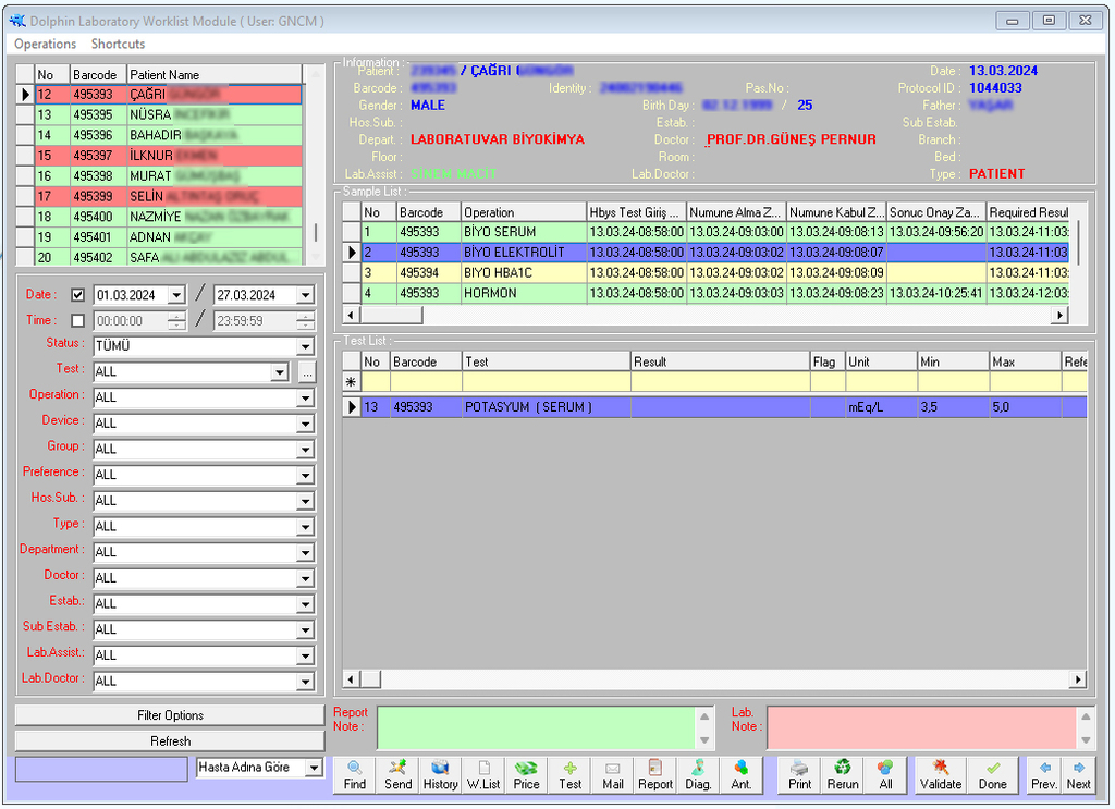 Dolphin is an advanced Laboratory Information Management System that controls the processes of entering patient records, making test requests, creating sample barcodes, accepting the created samples, transferring test data to medical devices, submitting the resulting tests to technicians and experts for approval, and reporting the results.